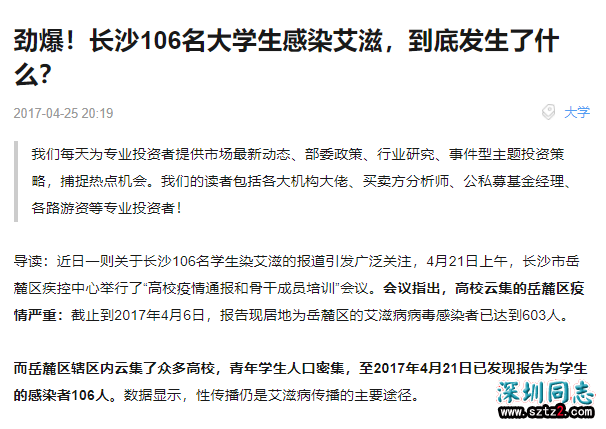长沙:截止到2017年4月6日,长沙市岳麓区疾控中心调查显示长沙有106名学生感染艾滋,而高校云集的岳麓地区的艾滋病毒感染者竟高达603人!