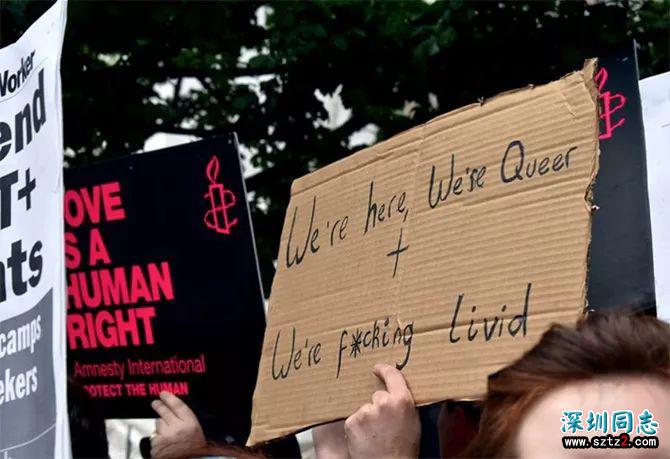 游行现场中有人举着“We’re here, we’re queer”牌子