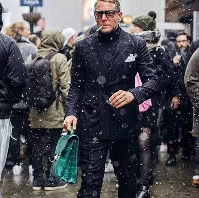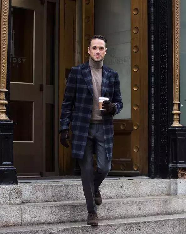 这三个单品的组合给了造型更多的选择,西装保持了正式感,高领毛衣和大衣既保暖又能为造型带来绅士感,所以说这样的商务造型就很适合在冬季穿着。